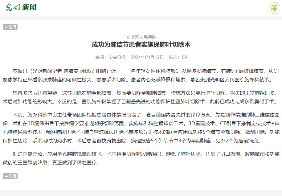 光明新闻:光明区人民医院成功为肺结节患者实施保肺叶切除术
