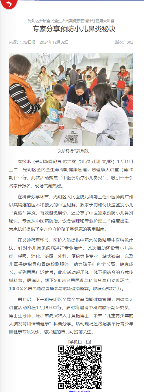 宝安日报:光明区开展全民全生命周期健康管理计划健康大讲堂 专家分享预防小儿鼻炎秘诀
