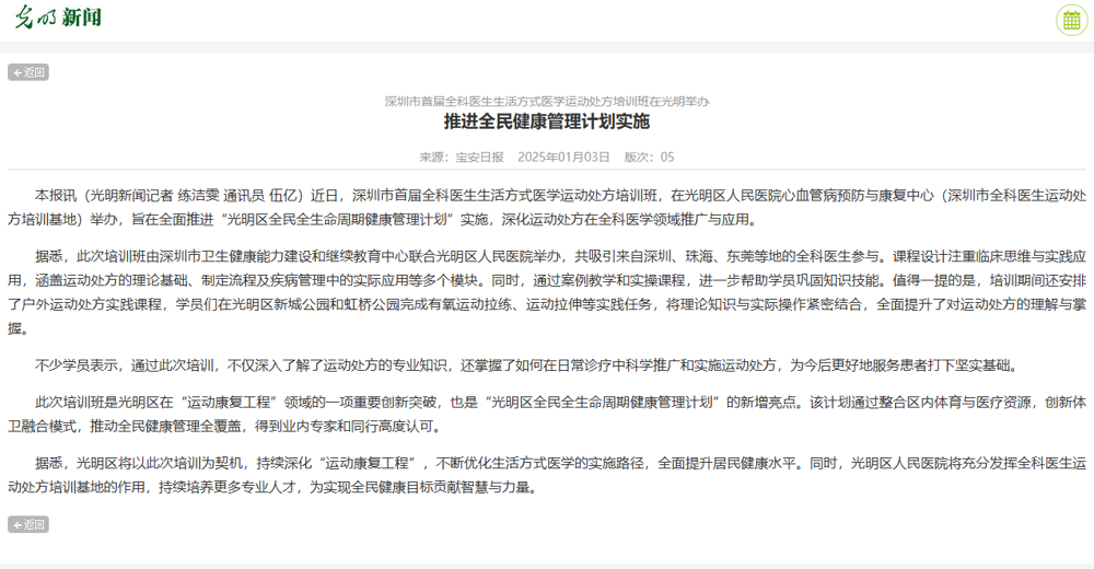 光明新闻:深圳市首届全科医生生活方式医学运动处方培训班在光明举办 推进全民健康管理计划实施