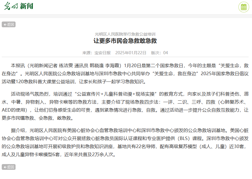 光明新闻:光明区人民医院举行急救公益培训 让更多市民会急救敢急救